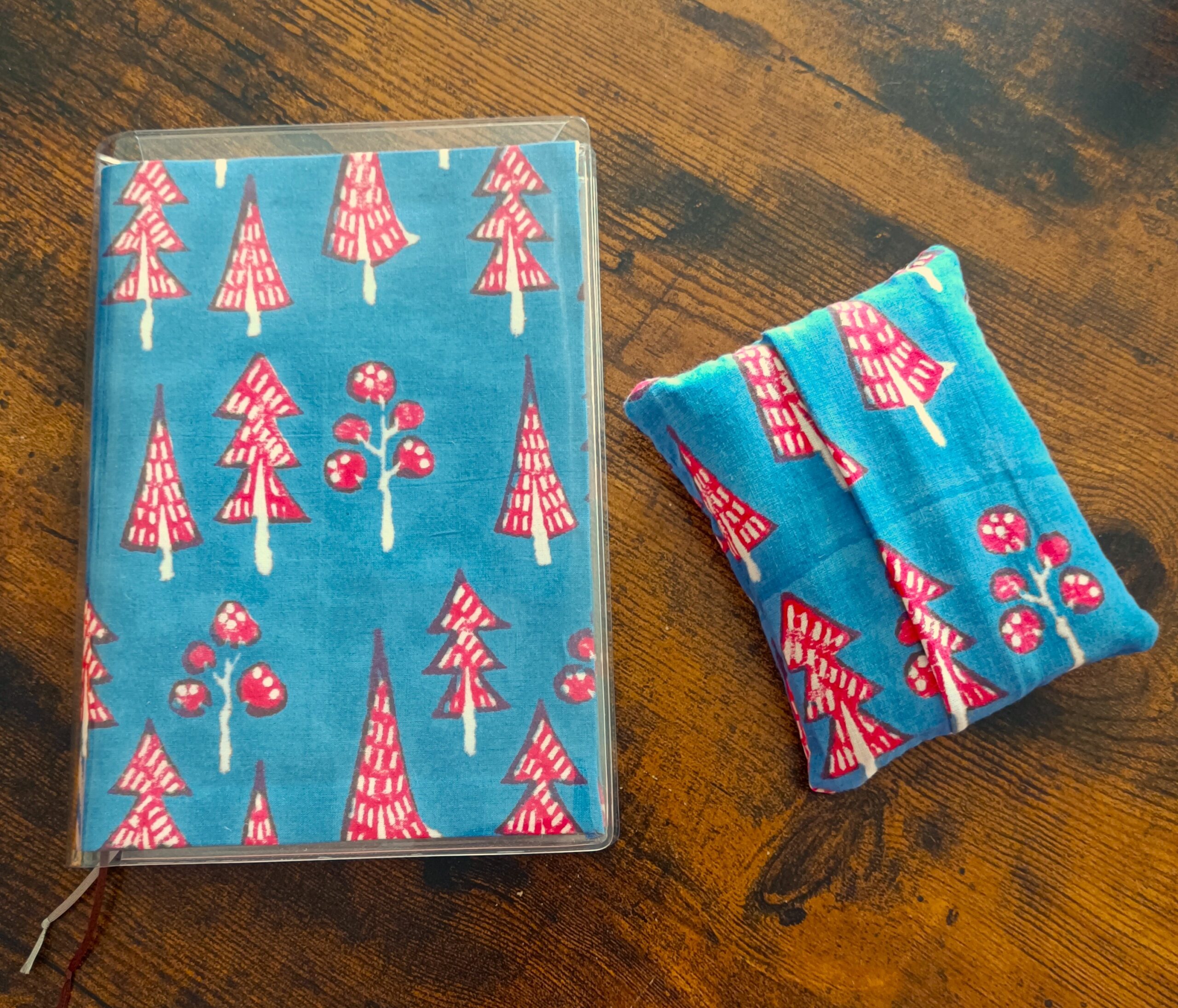 紙の色はアイボリーで目に優しく厚みもページがめくりやすく、透けないところが気に入ってたのに。来年のカバーは青地に赤の版画チックな樹木の模様です。いつものようにティッシュカバーもついでに作りました。来年に向けて準備万端!!。